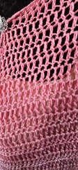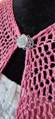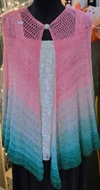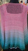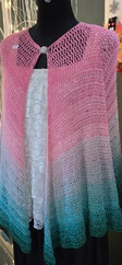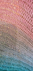 This gorgeous ombre shawl features delicate strands of iridescent glitter. This shawl is crocheted with a sport weight cotton. Can be machine washed on cold cycle in a mesh bag or pillow case to prevent pulls. Hang to dry. May be put in the dryer to fluff on no heat setting.