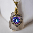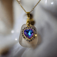 This beautiful necklace features a jeweled heart in front of a piece of genuine sea glass. This piece is perfect for sea lovers or for a gift on Valentine's Day or anniversary! The chain is 18 inch gold plated.