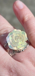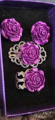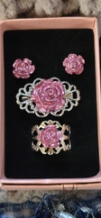 Each rose is handmade from resin. Earring posts are stainless steel, ring base and brooch is silver or gold plated.